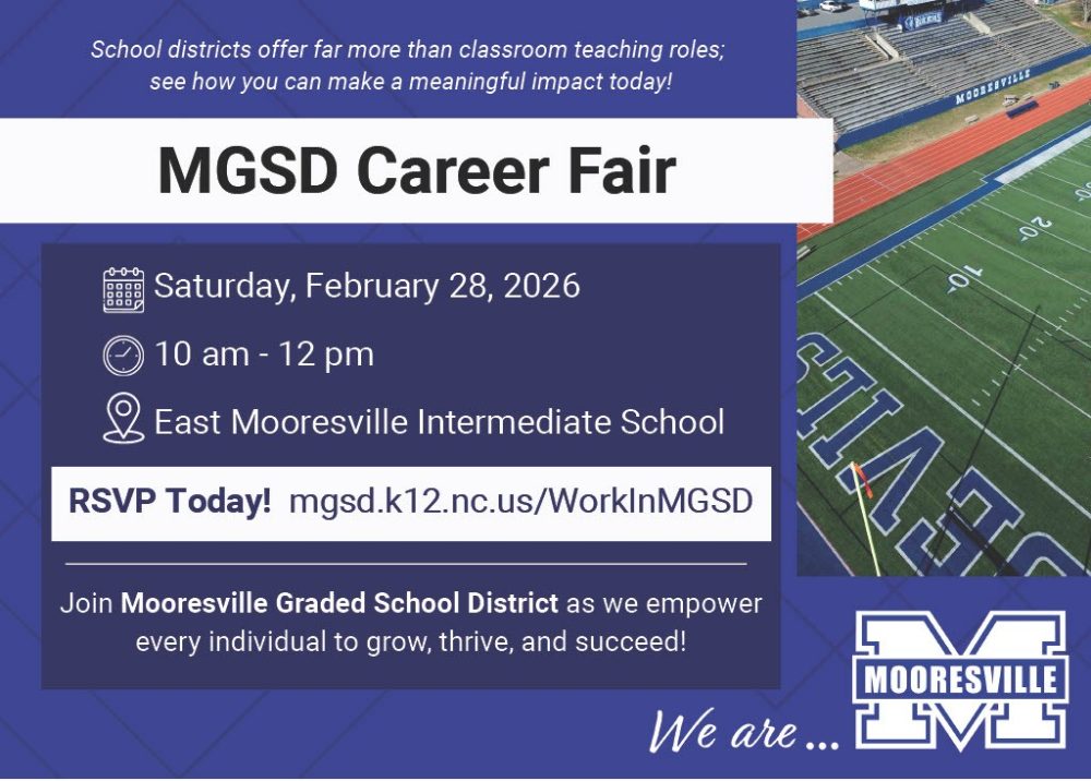 Mooresville Graded School District is excited to host an in-house career fair on February 28th to share our current and future job opportunities and the many reasons we love working in MGSD. Please contact Rachel Bustle at email (rachelbustle@mgsd.k12.nc.us) or phone (704-658-2757).