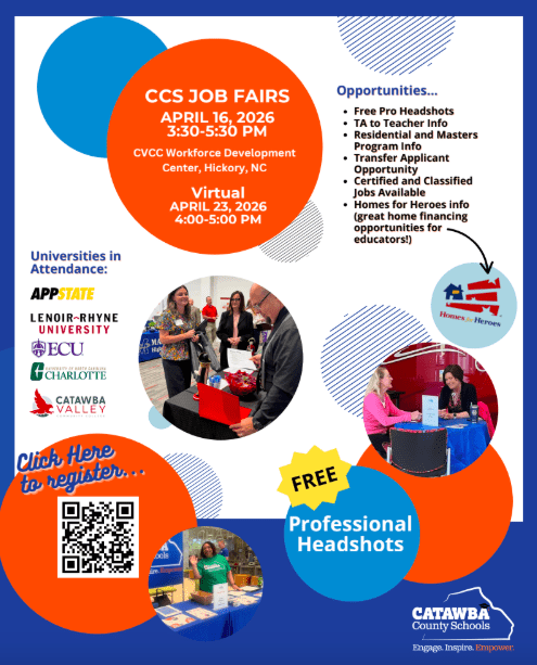 Catawba County Schools Job Fair! Besides having the opportunity to meet with every principal/district leader in the district, you will also have the opportunity to get free professional headshots, meet with local universities, and chat with a rep from “Homes for Heroes,” which is a way for educators to save money buying, selling, or refinancing a home. REGISTER using the QR code on the invitation or by using this link.
