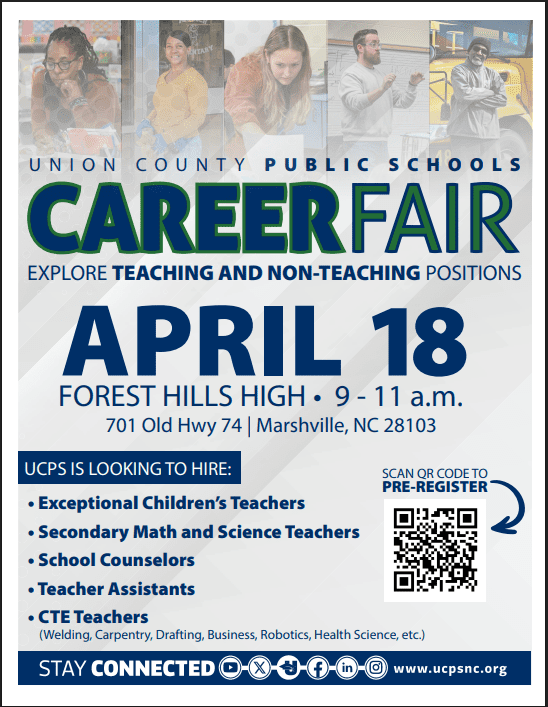 Union County Public Schools is hosting a Career Fair on April 18 from 9-11 am at Forest Hills High School