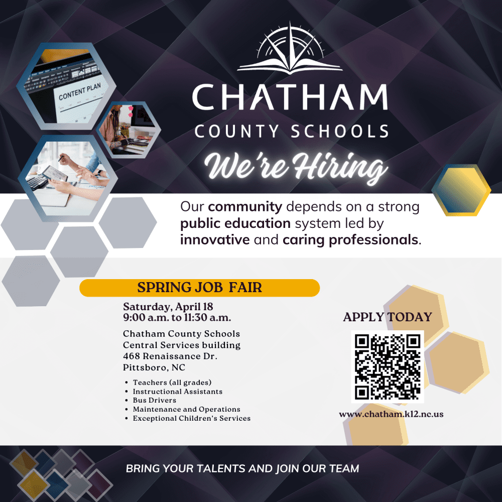 Chatham County Schools is hiring! Their spring job fair is on April 18th!
